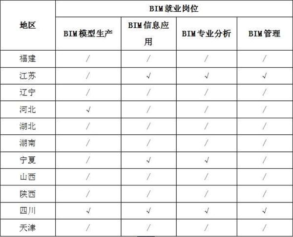 3、就業(yè)崗位分布。從11個省市的BIM就業(yè)崗位分布來看,不同地區(qū)的企業(yè)對BIM人才的崗位需求也各不相同,BIM技術(shù)應(yīng)用發(fā)達的地區(qū)更需要能將BIM技術(shù)與生產(chǎn)過程融合的復合型人才,不局限于BIM建模工作,例如江蘇省企業(yè)招聘的人員以BIM信息應(yīng)用,BIM專業(yè)分析和BIM項目管理為主。