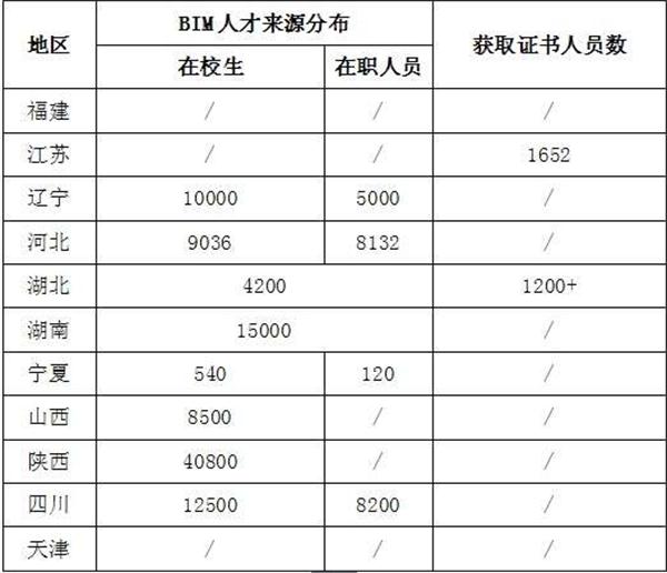 1、來源分布。11個省市提供的數(shù)據(jù)表明,BIM人才主要來源于在校學生,以及接受BIM相關(guān)培訓的企業(yè)在崗人員,詳見表所示。